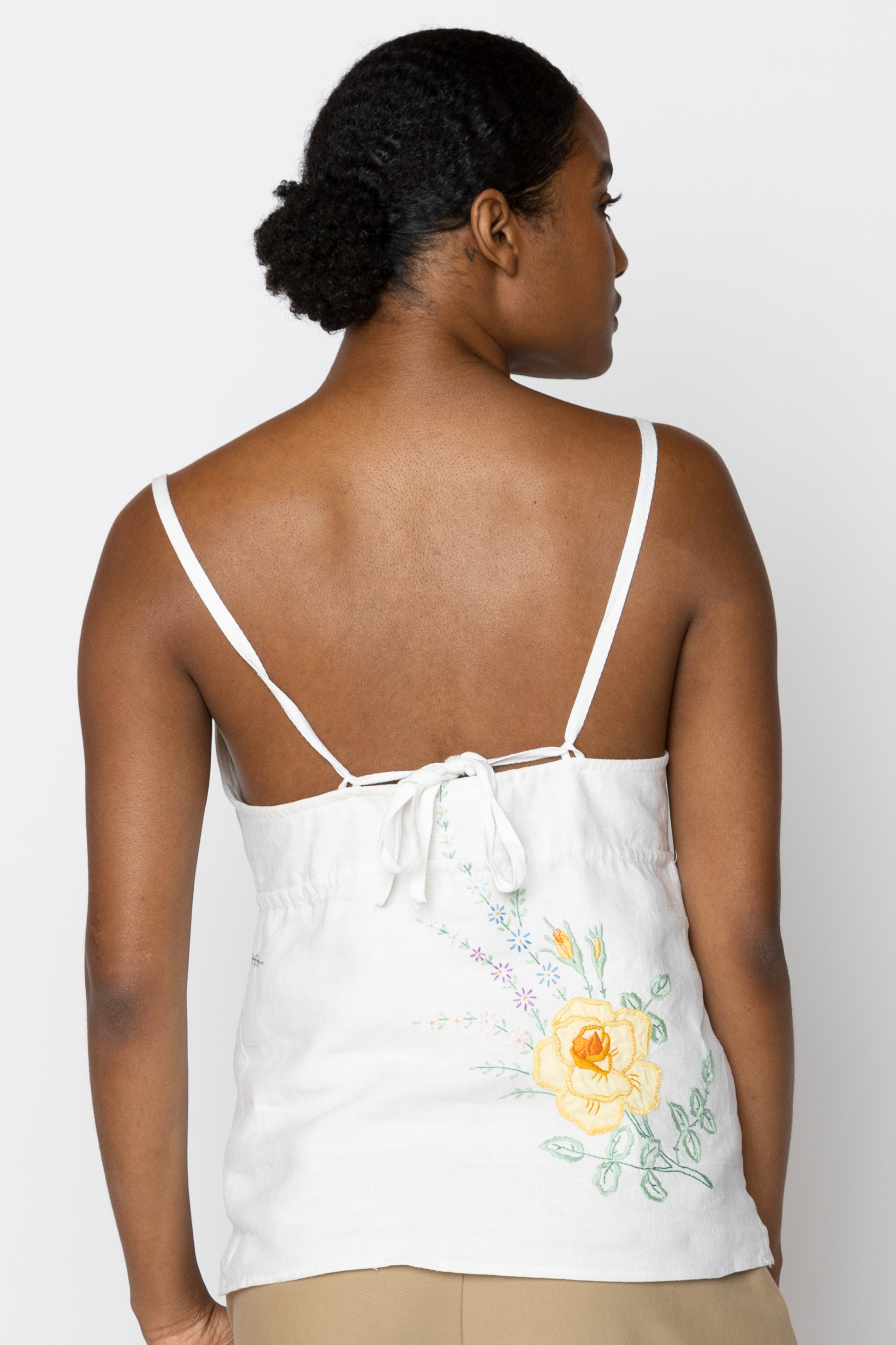 Delicate linen cami with vintage inspired placement embroidery at bust cups and hem. Fully lined with cotton lawn lining. Cami measures 22” from HPS.