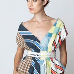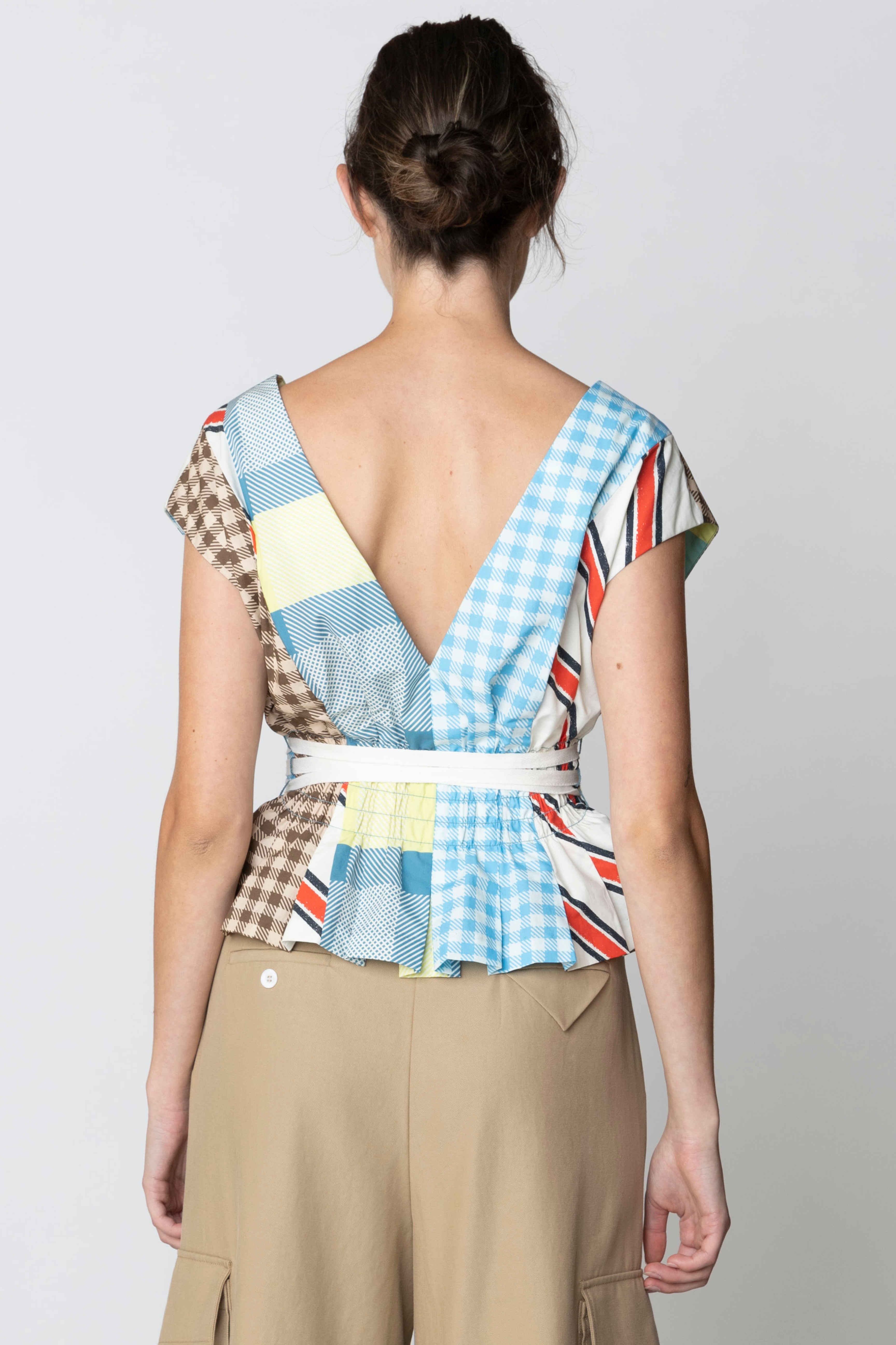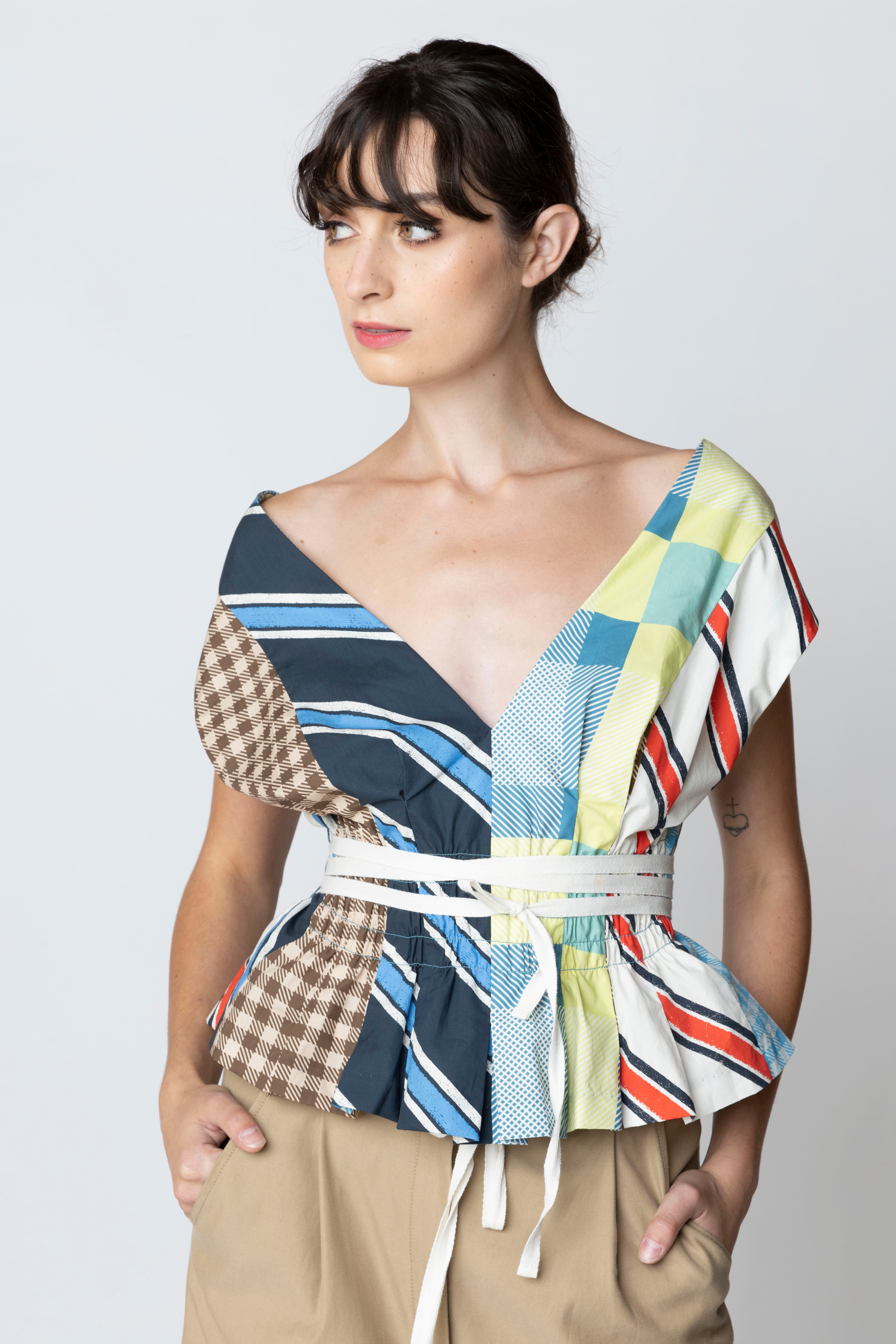 Pleated organic cotton poplin V neck top with tucks at bodice and box pleats at waist. Smocking and twill tape belt cinch in waist. Top measures 22” from HPS.
