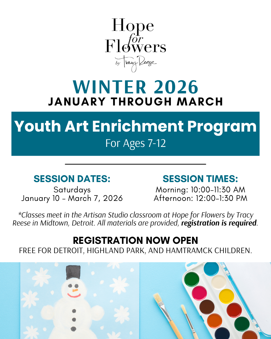 Saturday art classes are open to children ages 7 to 12 who attend public or charter schools—or are homeschooled—in Detroit, Highland Park, or Hamtramck.
