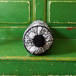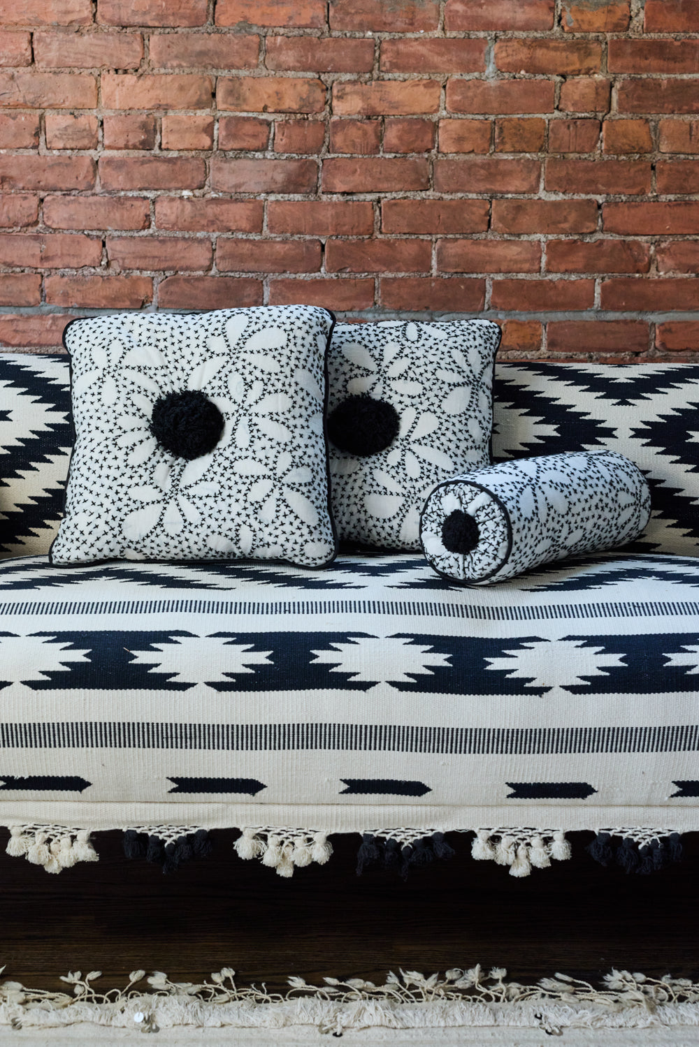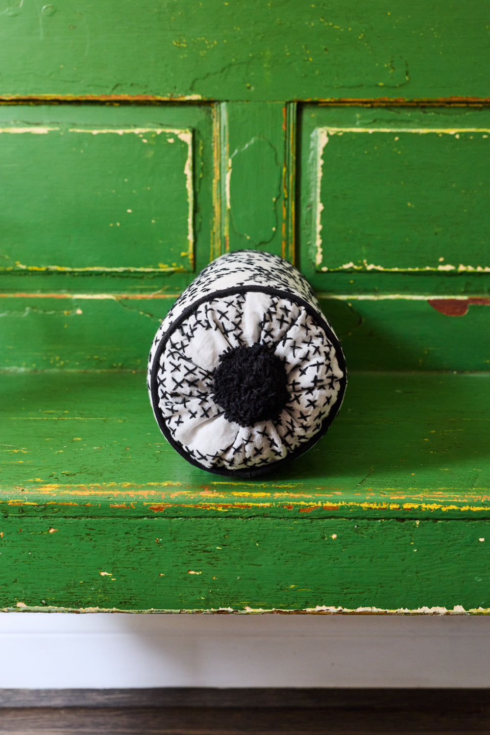 • We have piped the edges and added pompoms in black to match the embroidery.