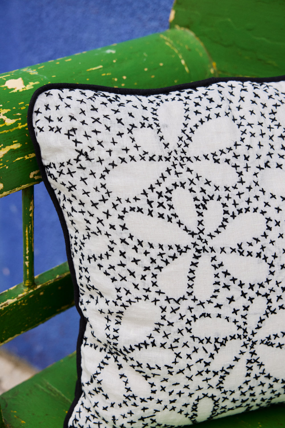 • Our 20”square cushion is made from white linen hand embroidered by artisans in India and backed in luxurious black velvet.
