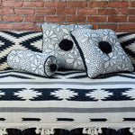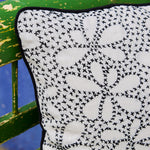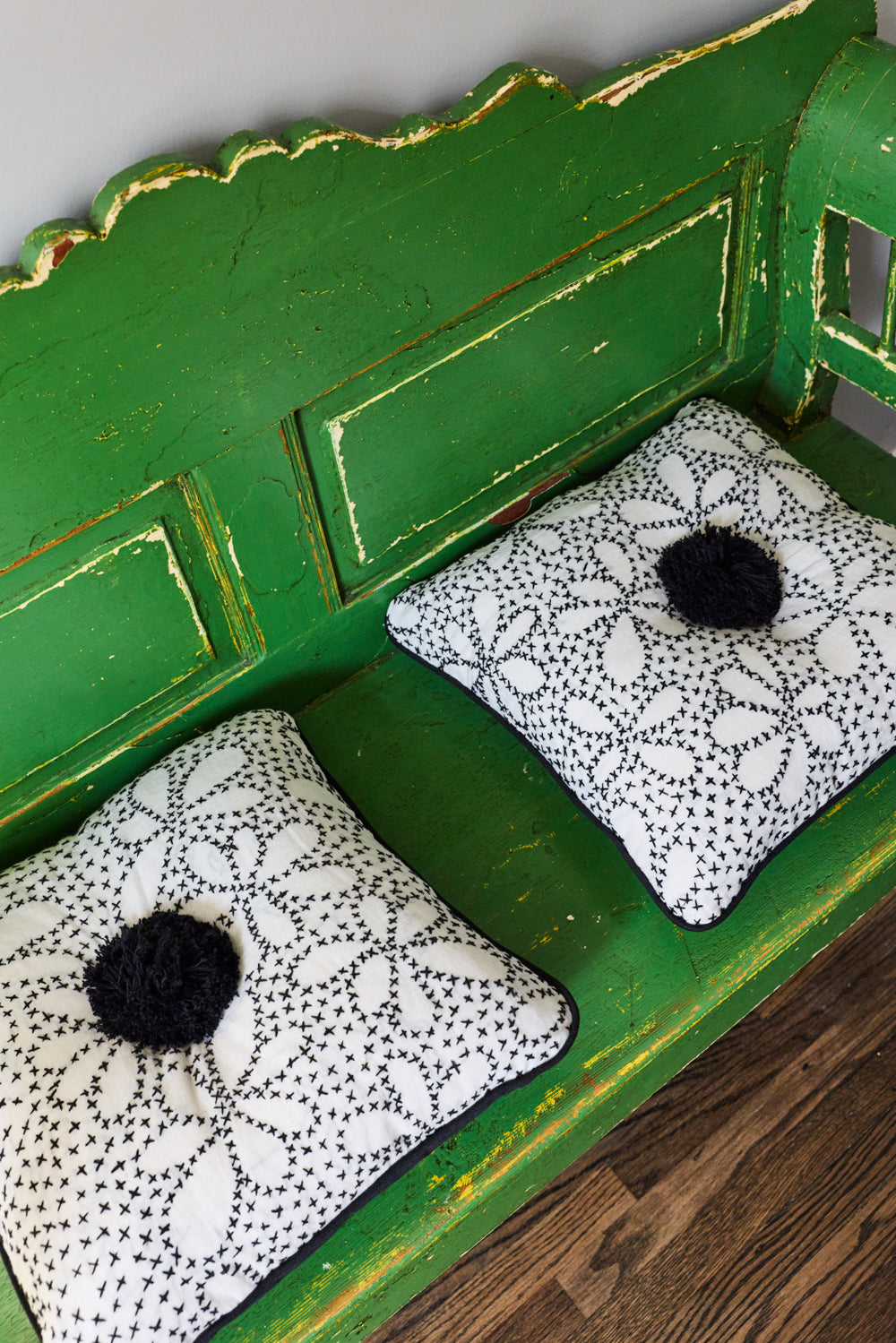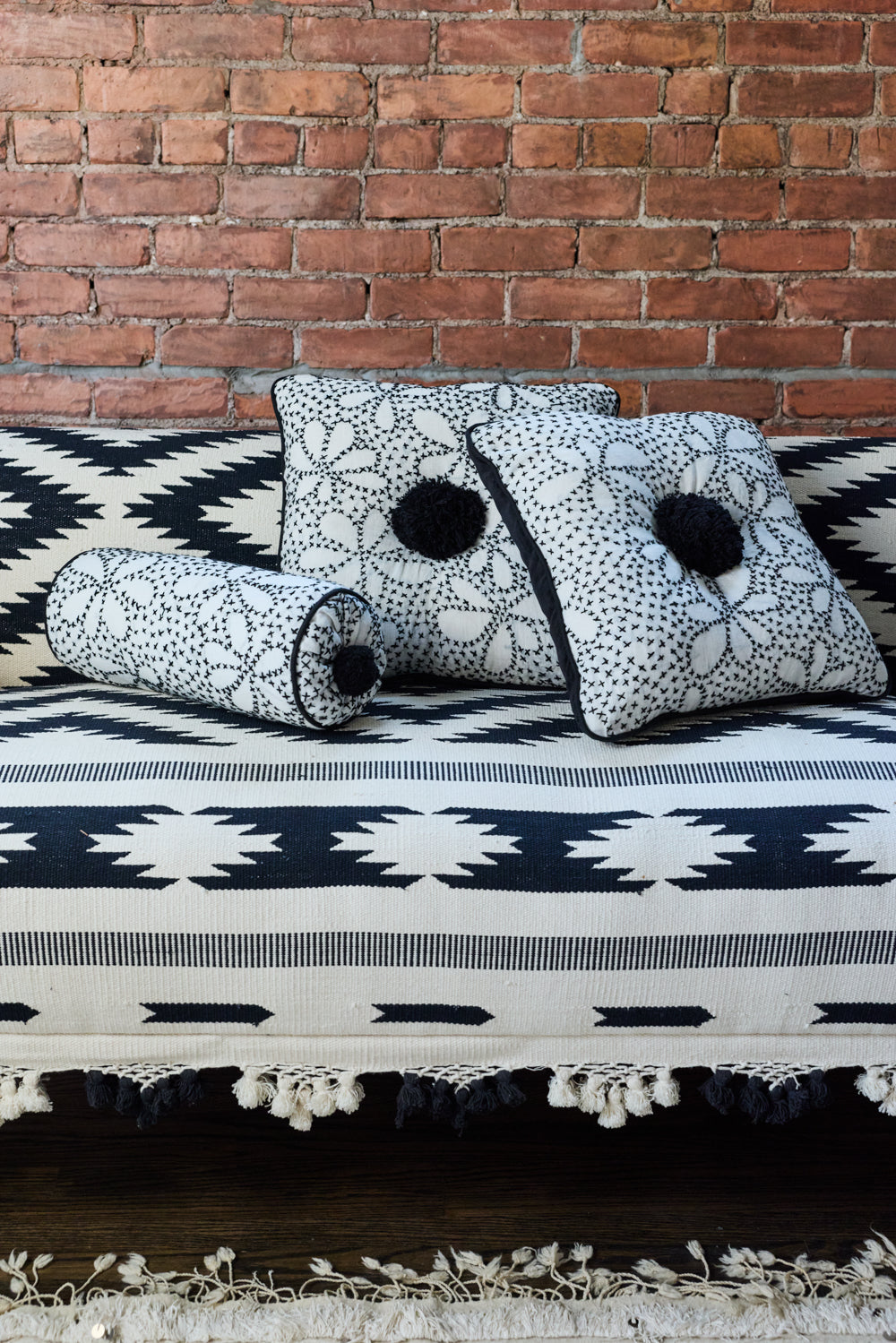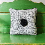 • We have piped the edges and added a large center pompom tuft in black to match the embroidery.