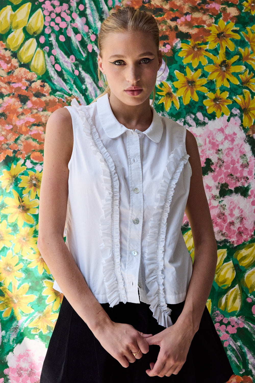 • Classic sleeveless blouse with peter pan collar and frill applique detailing at front bodice.